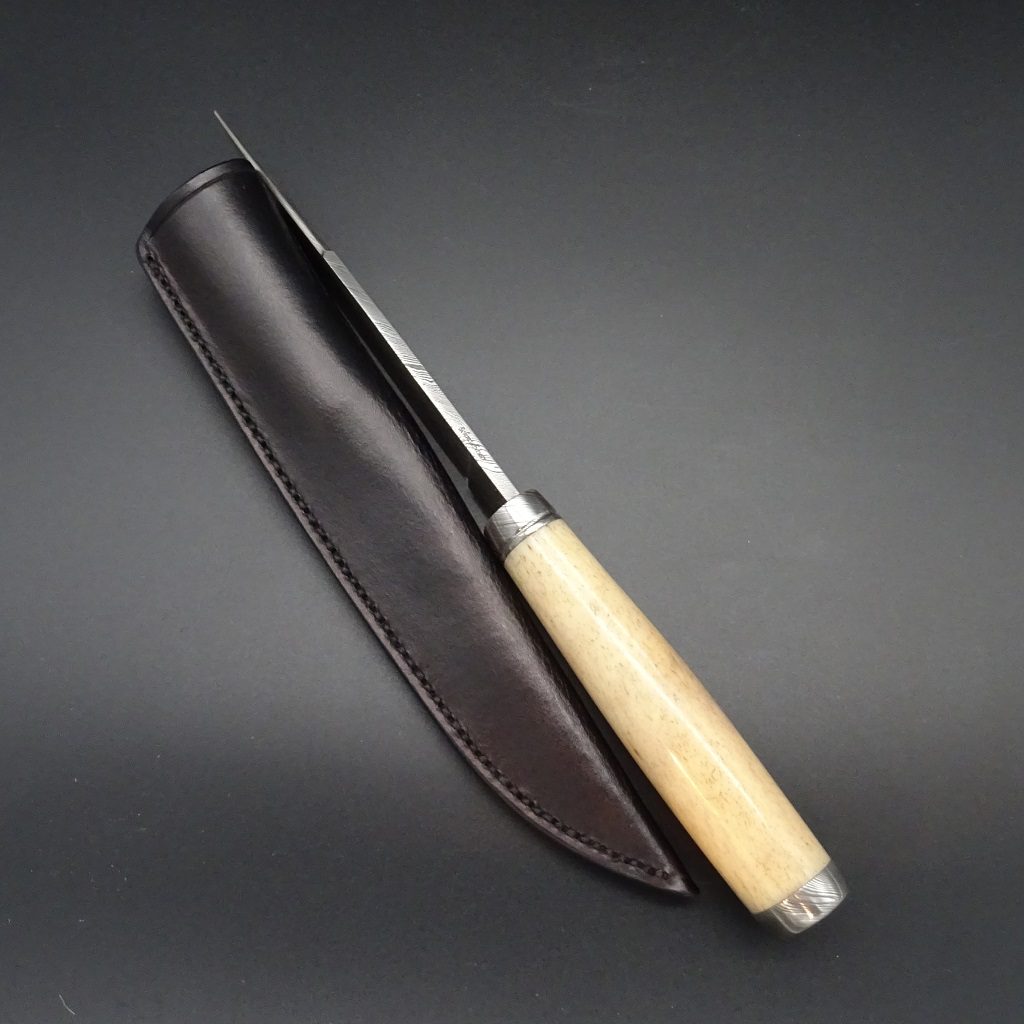 Älteres handgefertigtes H. Schmidbauer Oosik Hunter Sammlermesser mit Klinge aus Messerwerk-Damast und Griff aus Oosik. Eine Rarität für den Kenner und Liebhaber feiner handgefertigter Messer.