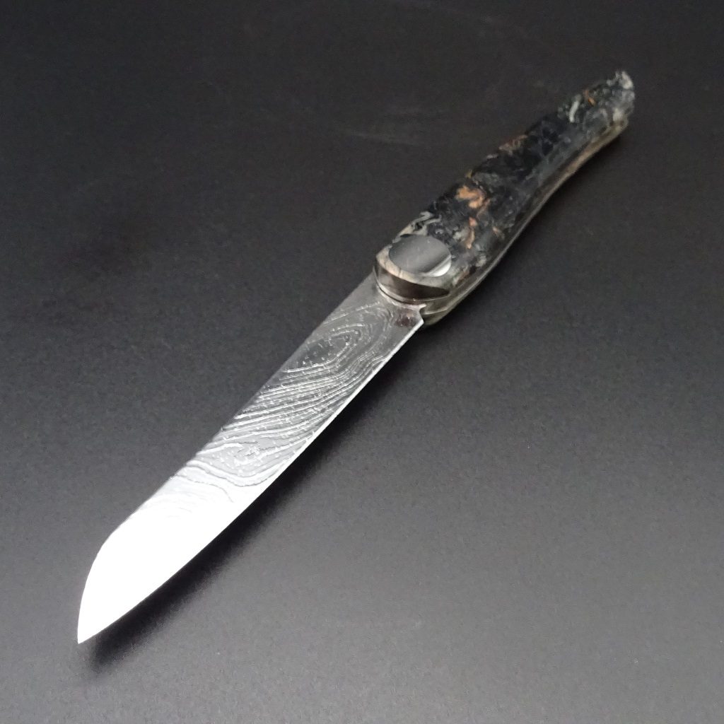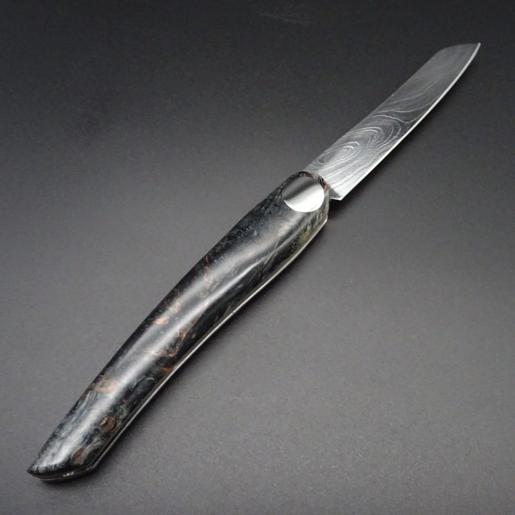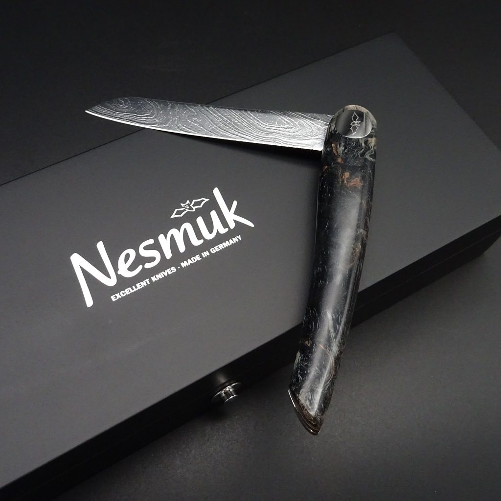 Hier präsentieren wir ein exzellentes Nesmuk Exclusiv Goumet Folder Damaststahl mit wunderschönem Griff aus schwarzer Maserbirke, wahrlich ein Begleitmesser fürs Leben!